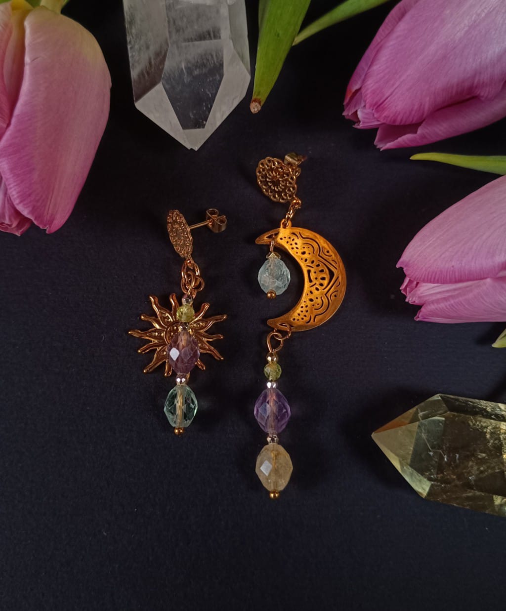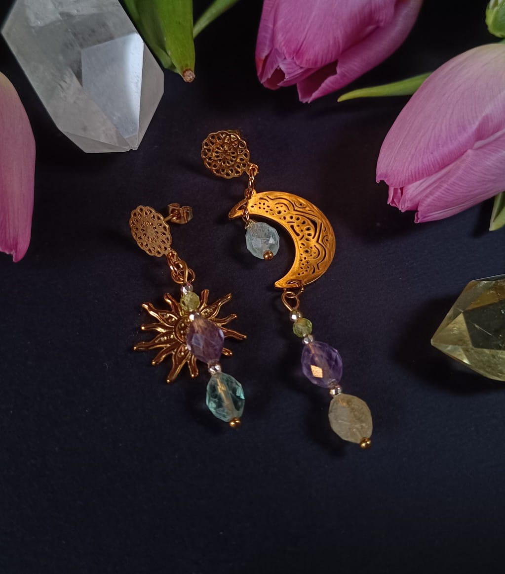 Asymetryczne kolczyki ze stali chirurgicznej, z fluorytem, oliwinem i cytrynem. Długość kolczyka z księżycem: 6,7 cm. Długość kolczyka ze słońcem: 4,5 cm.