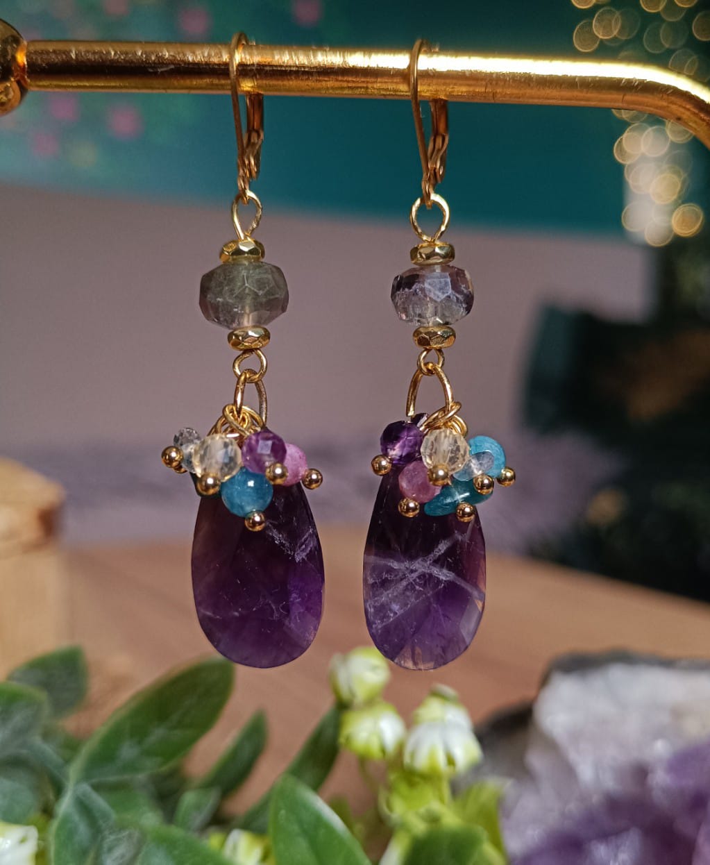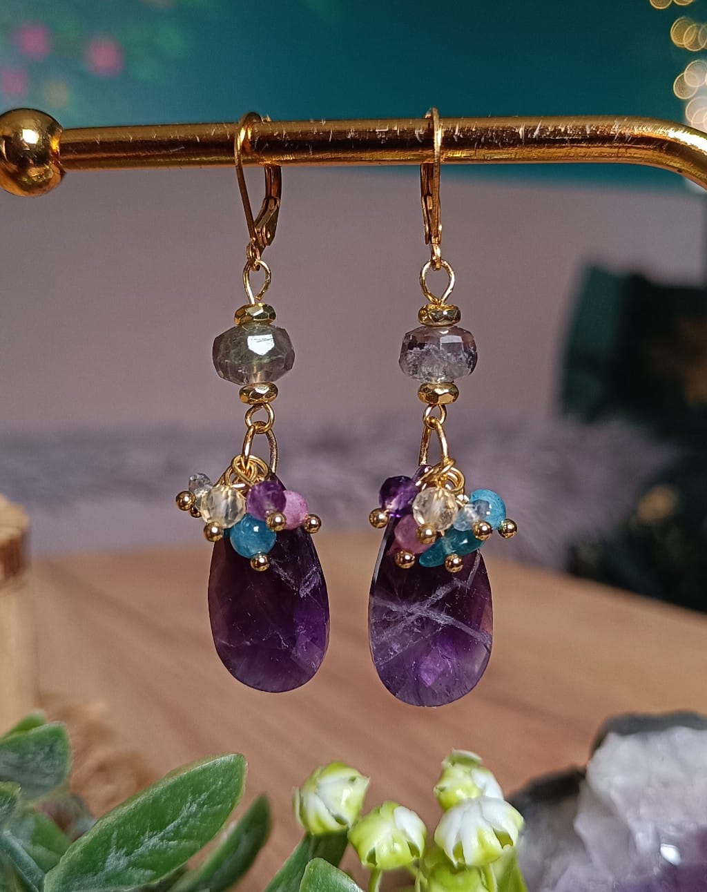 Przepiękne kolczyki z kamieni naturalnych i stali chirurgicznej. Łezki z ametystów ozdobione malutkimi fluorytami, ametystami, apatytami, cytrynami i różowymi turmalinami. pod biglami piękne fluoryty. Długość: 6 cm.