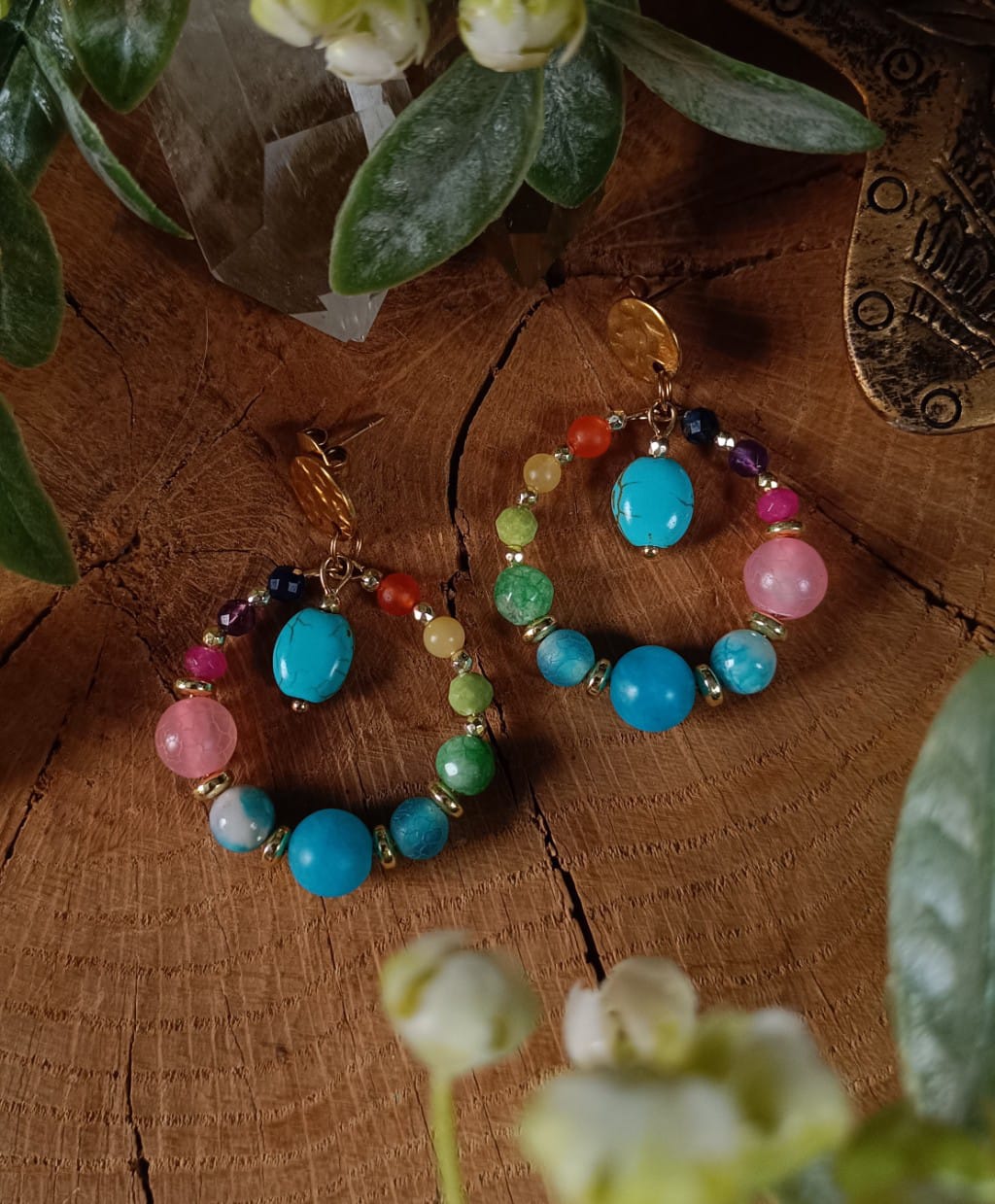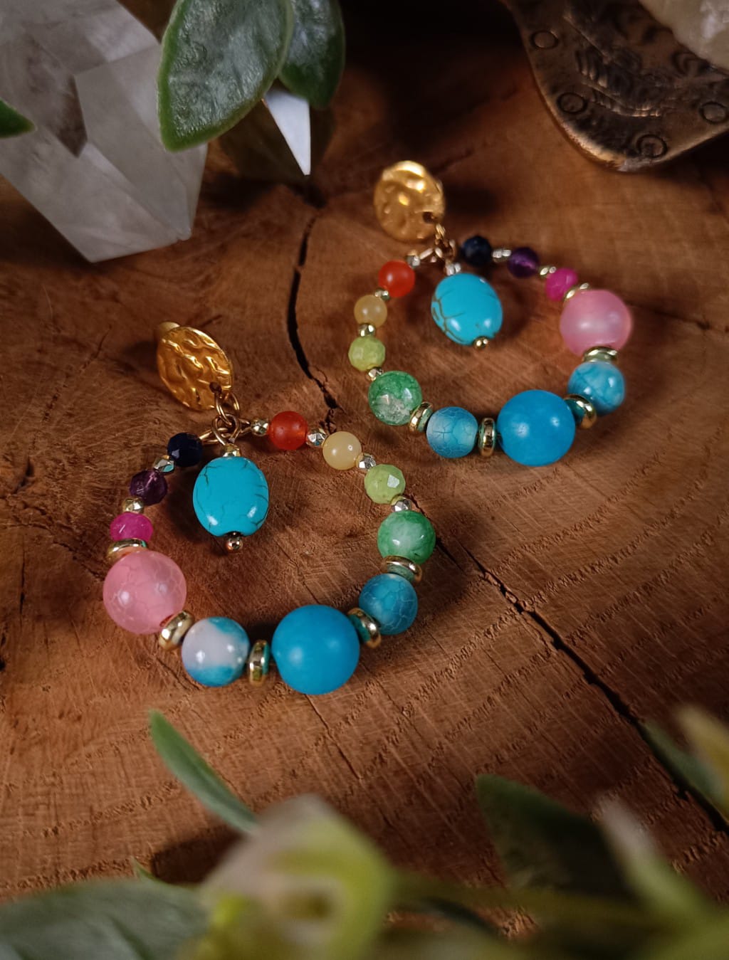 Kolczyki koła ze stali chirurgicznej, z kolorowymi kamieniami naturalnymi. Mamy tutaj kianit, ametyst, barwione jadeity i trawione agaty, oraz złocone hematyty. Długość: 4,5 cm.
