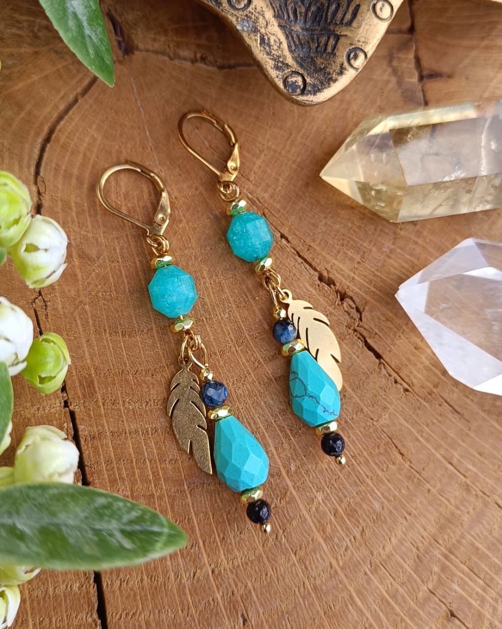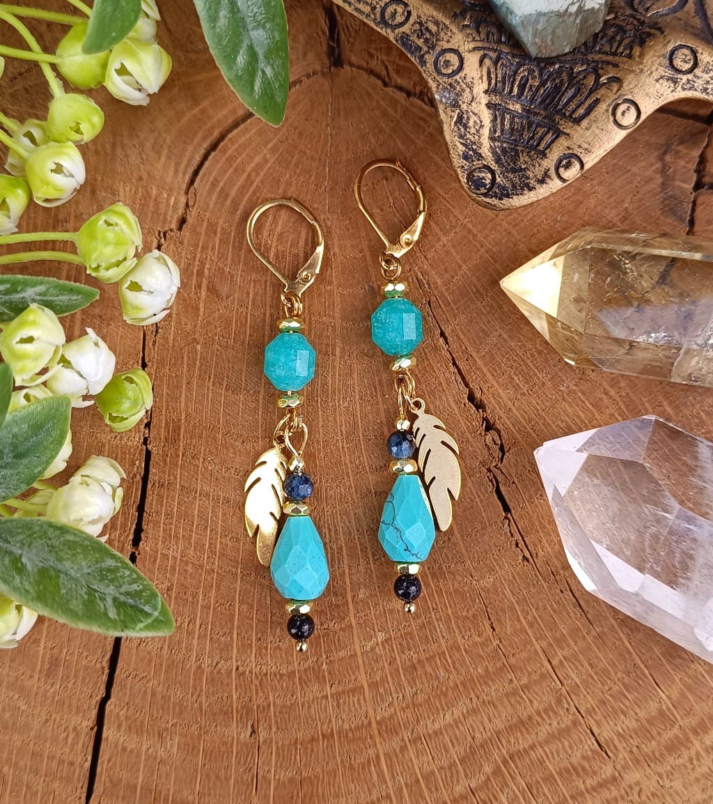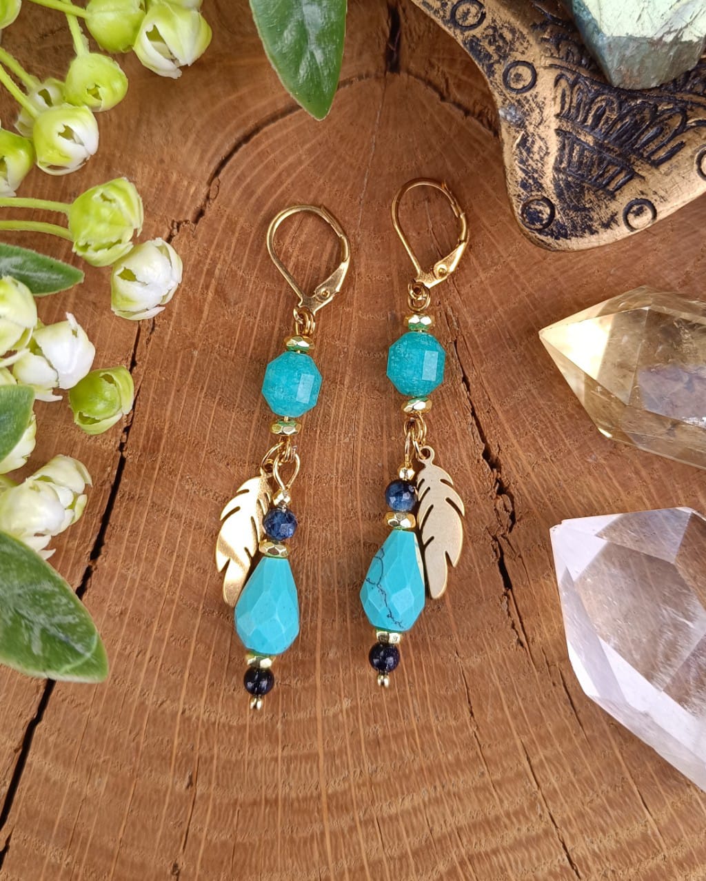 Długie kolczyki na bazie ze stali chirurgicznej, z kamieniami naturalnymi: amazonitem, barwionym howlitem, złoconymi hematytami, kianitem. Mamy tutaj również Noc Kairu. Długość: 6,4 cm.