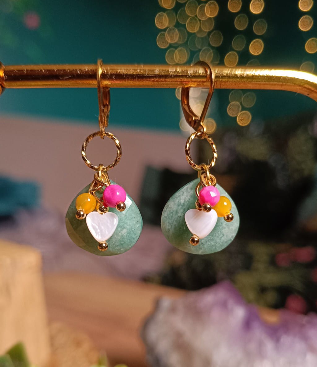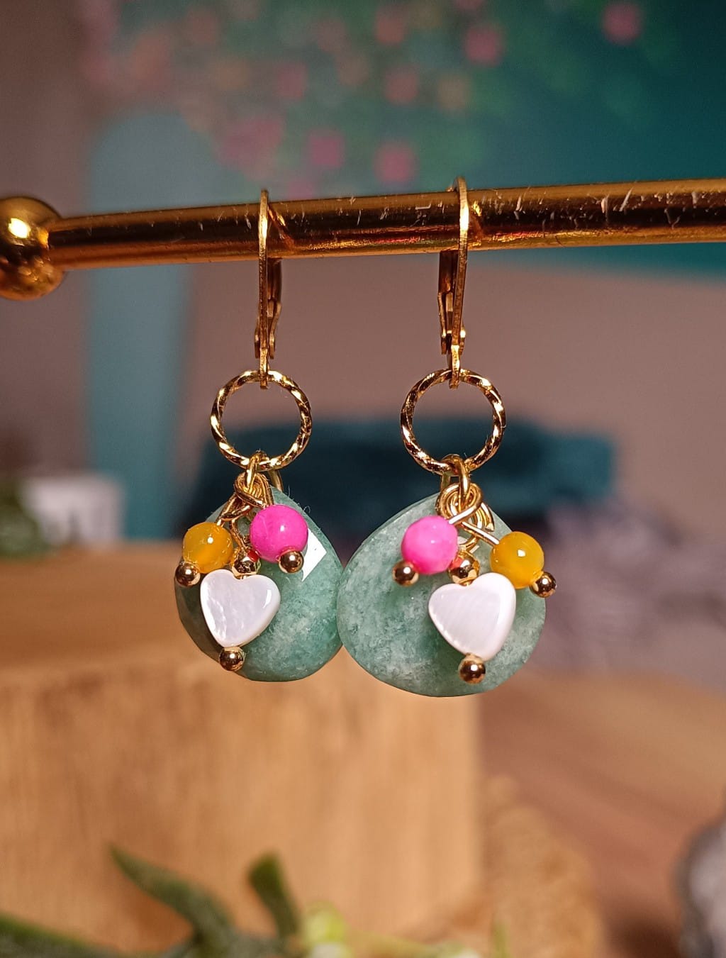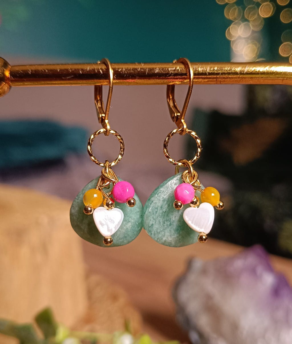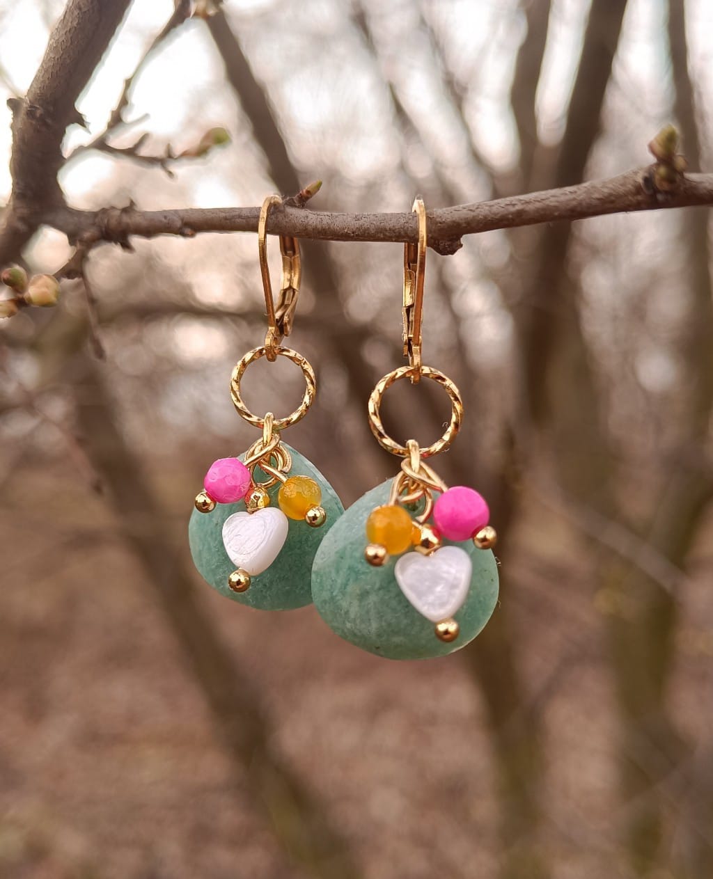 Słodkie, delikatne i kobiece – kolczyki z kamieni naturalnych i stali chirurgicznej. Łezka wykonana z amazonitu, a na niej malutkie zawieszki z masy perłowej i barwionego agatu. Długość: 3,8 cm.
