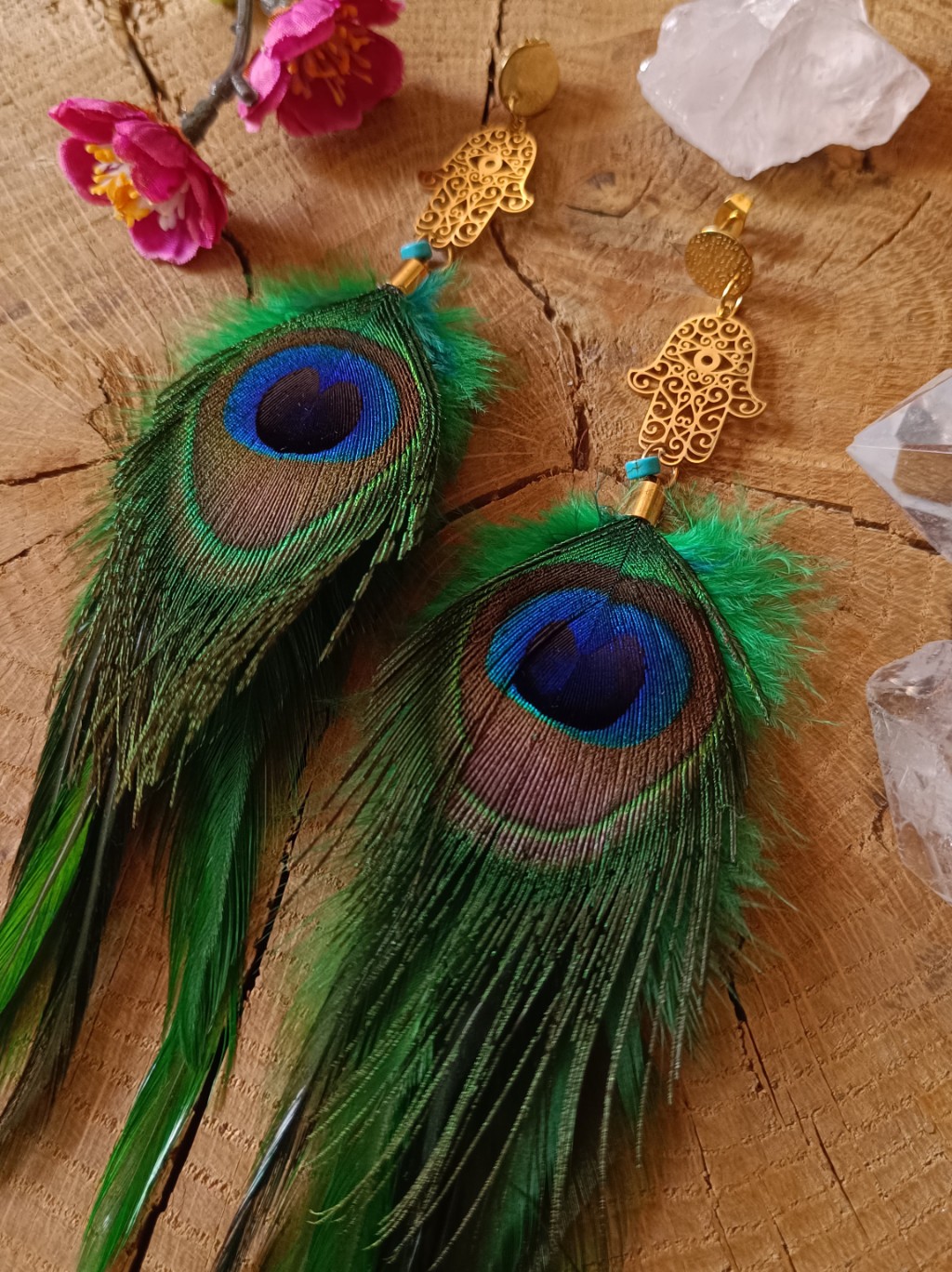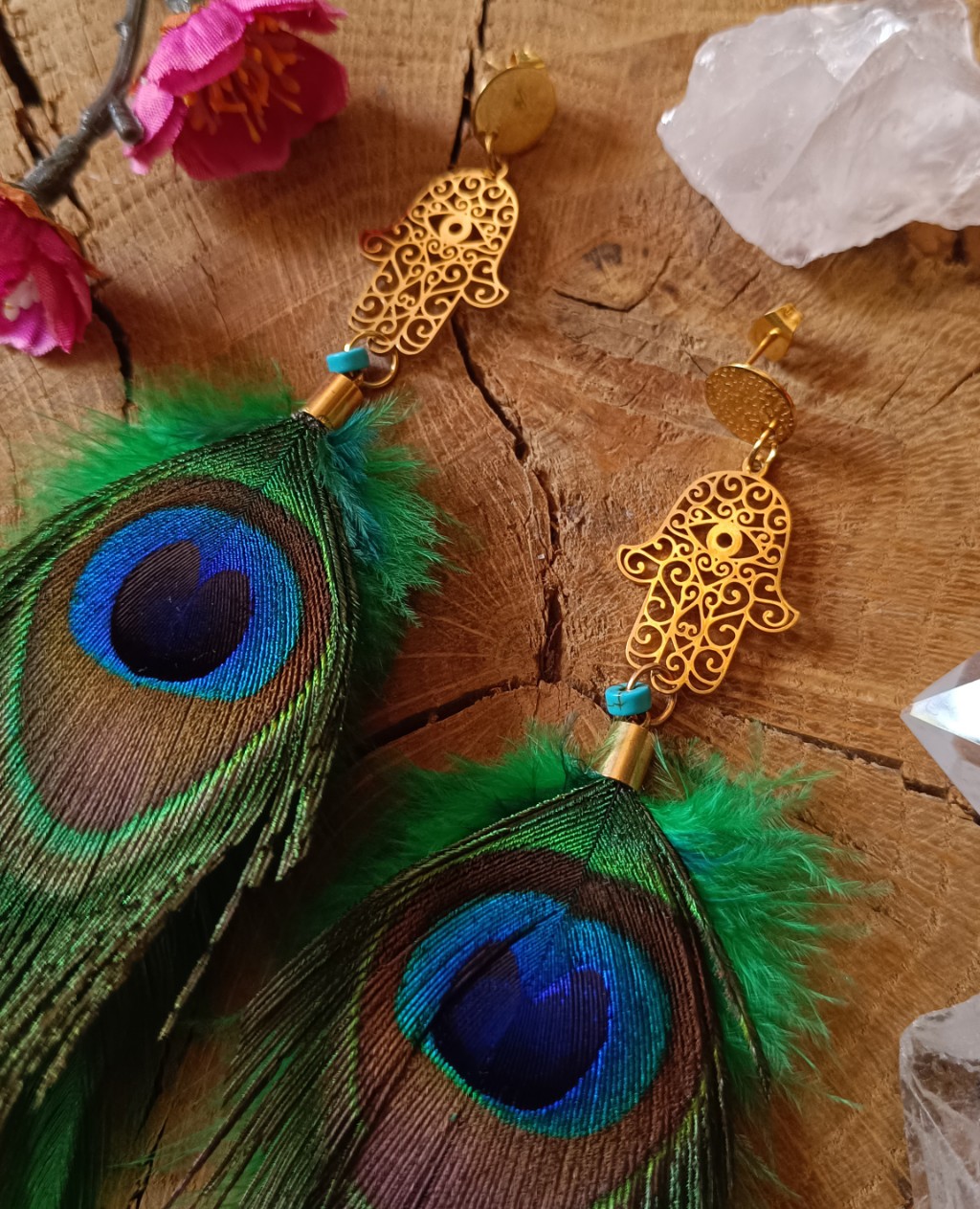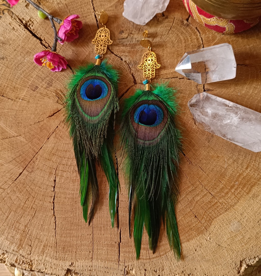 Kolczyki z naturalnych piór, z zawieszkami w kształcie hamsy…leciutkie i zwiewne. Stal chirurgiczna. Długosć: 18 cm.