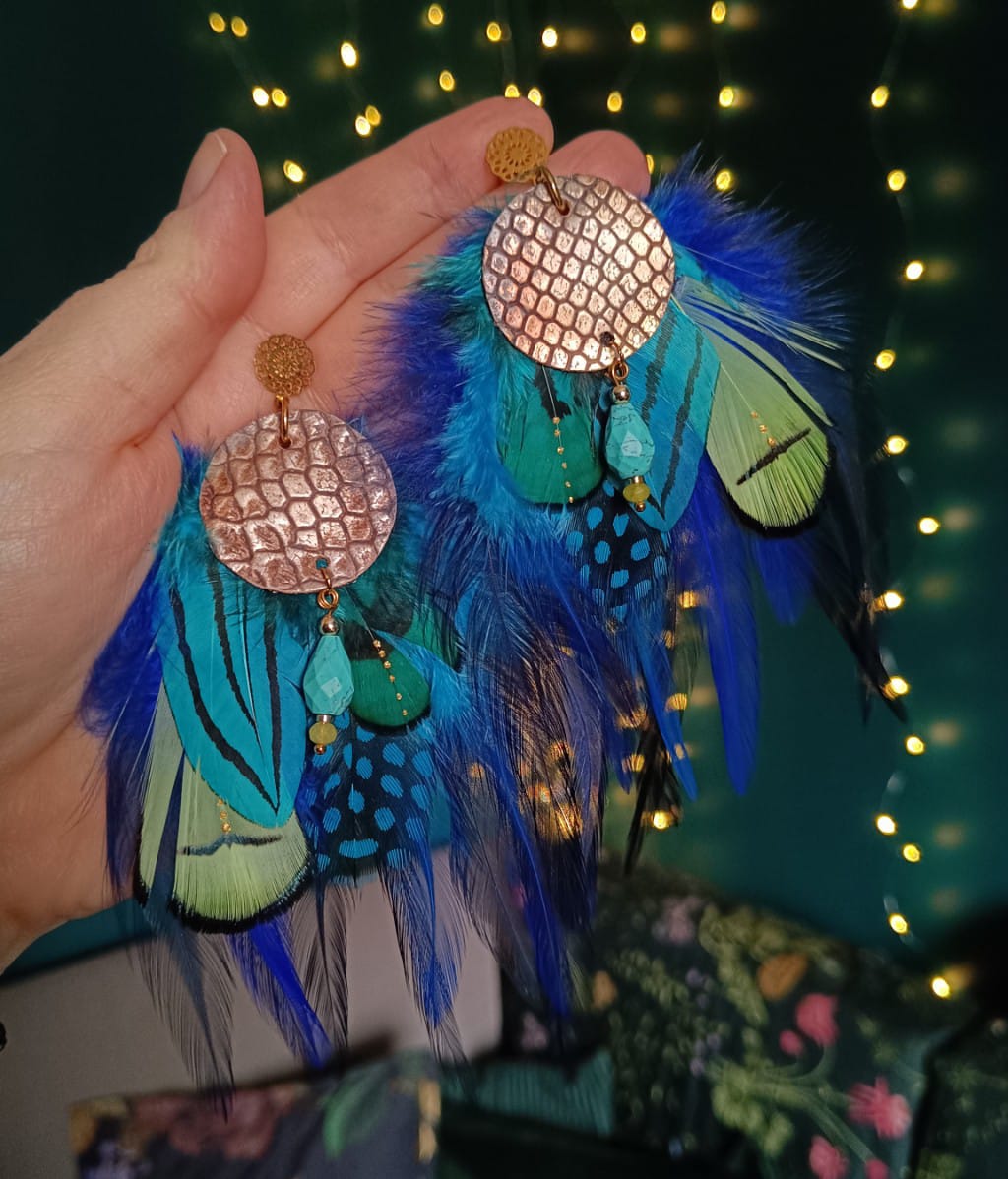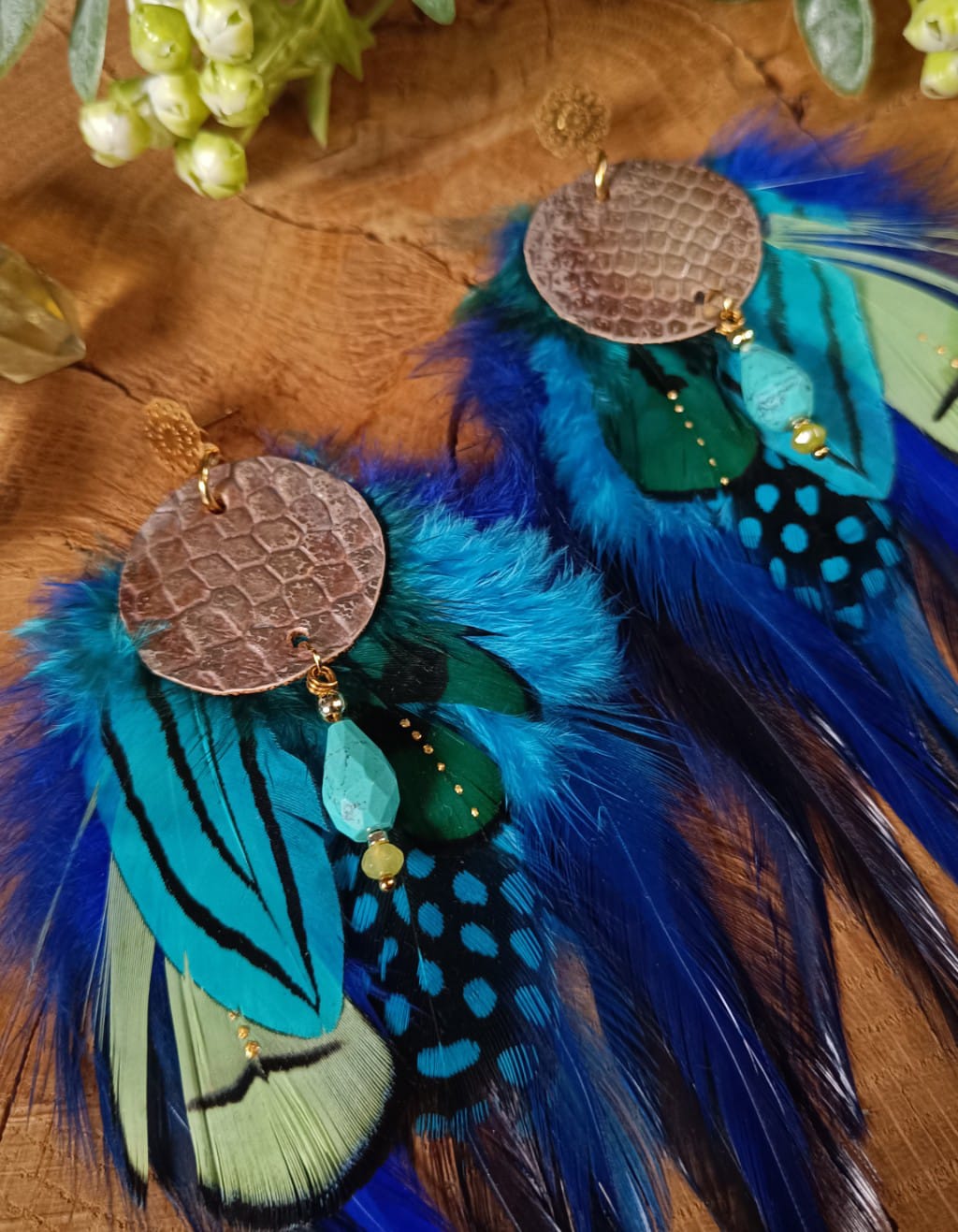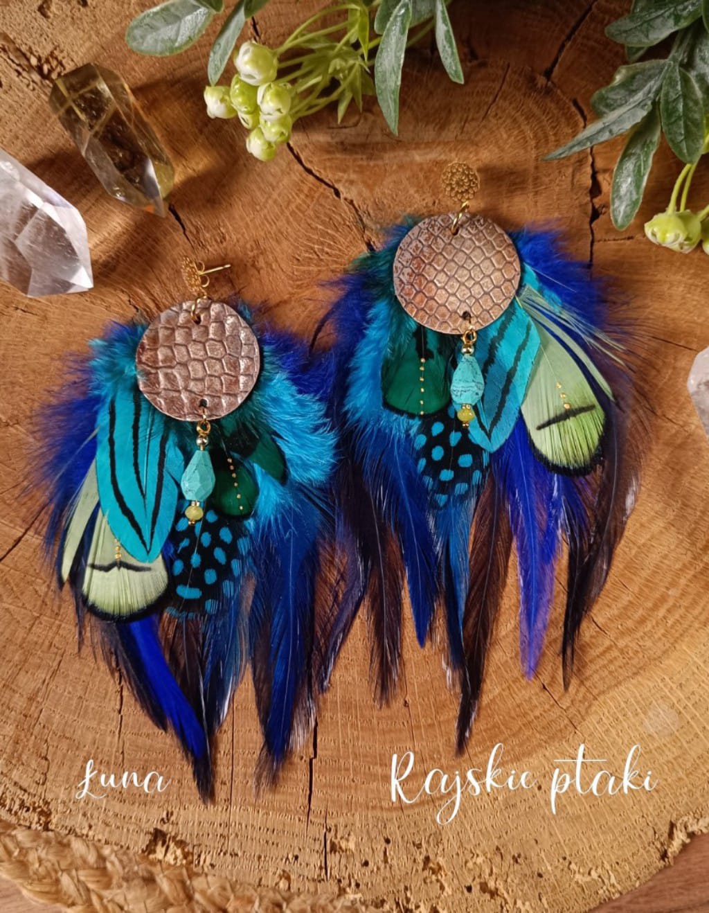 Kolczyki Rajskie Ptaki. Niezwykle lekkie, kolorowe, kobiece. Pióra okiełznane ręcznie zdobioną skórą. Długość: około 15 cm. Zawieszka z barwionego howlitu i jadeitu. Elementy metalowe – stal chirurgiczna.