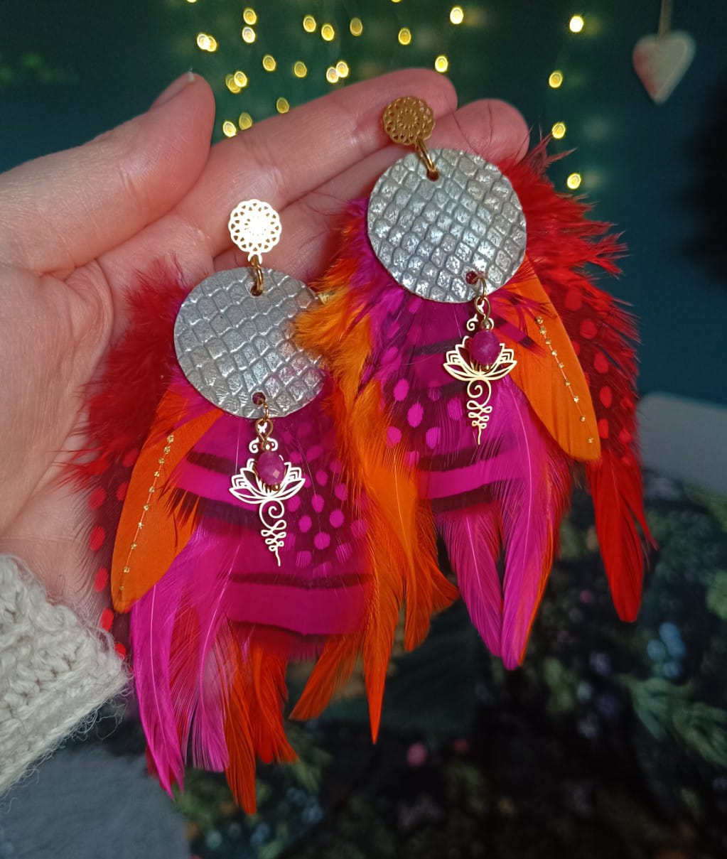 Rajskie Ptaki,. czyli naturalne pióra okiełznane skórą eko. Są bardzo strojne, a przy tym niezwykle lekkie. Długość: 12,5 cm. Maleńkie zawieszki z różowych agatów. Elementy metalowe – stal chirurgiczna.