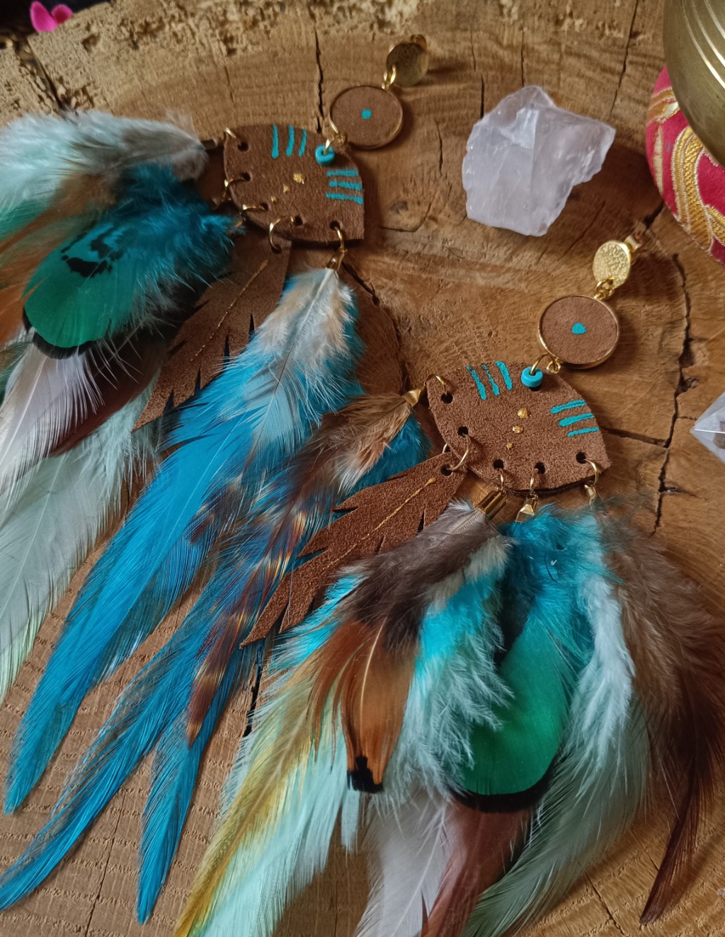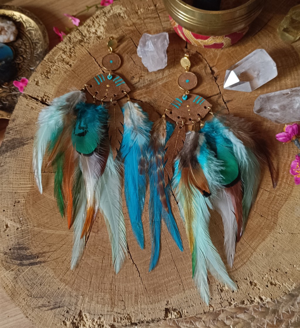 Kolczyki Rajskie Ptaki: pióra na bazie z ręcznie malowanej skóry z dodatkiem stali chirurgicznej. Kolczyki są ultra lekkie, zapomnisz, że masz je na sobie…Długość: 20cm.