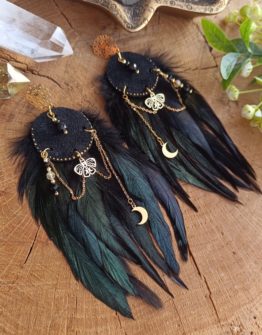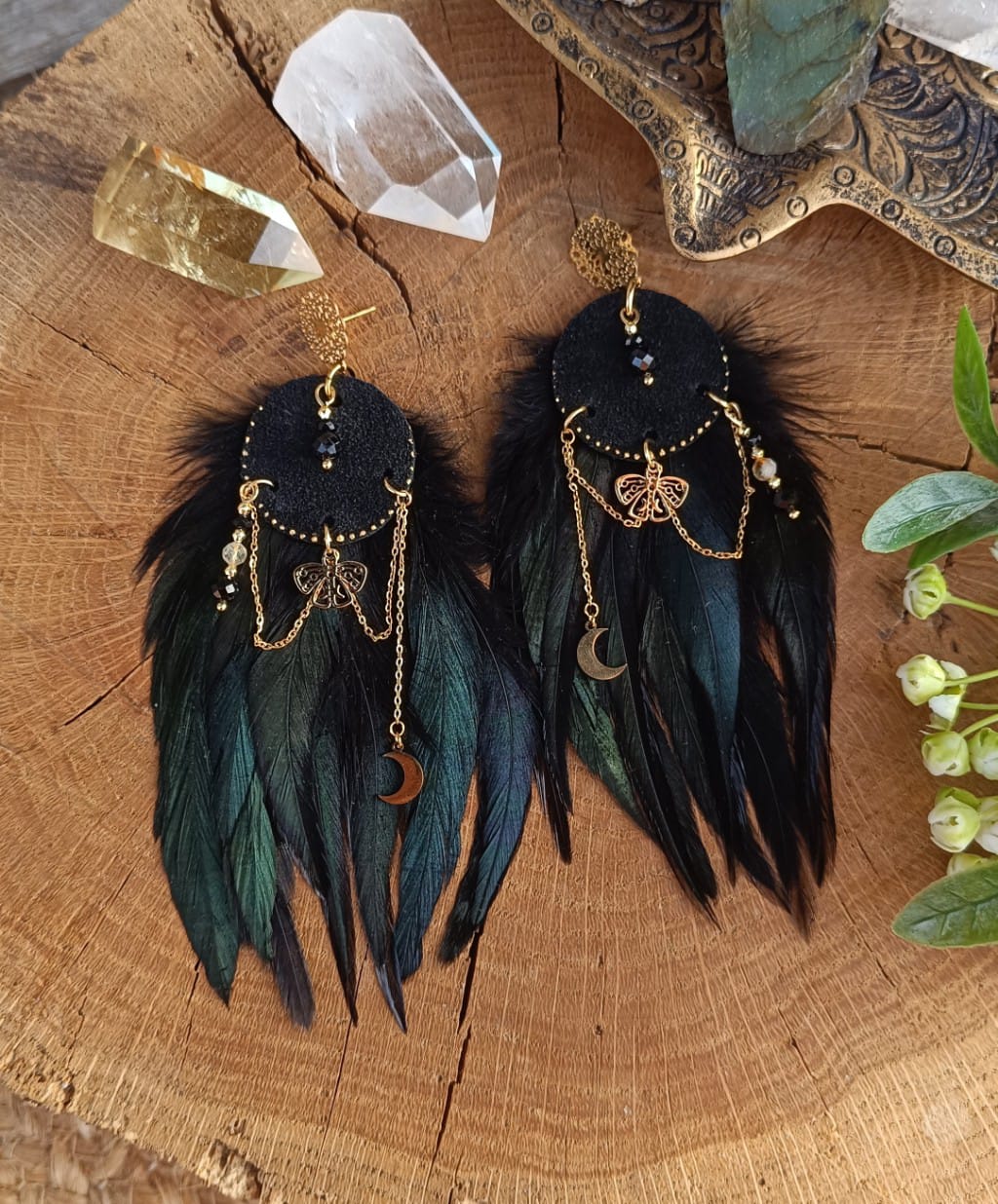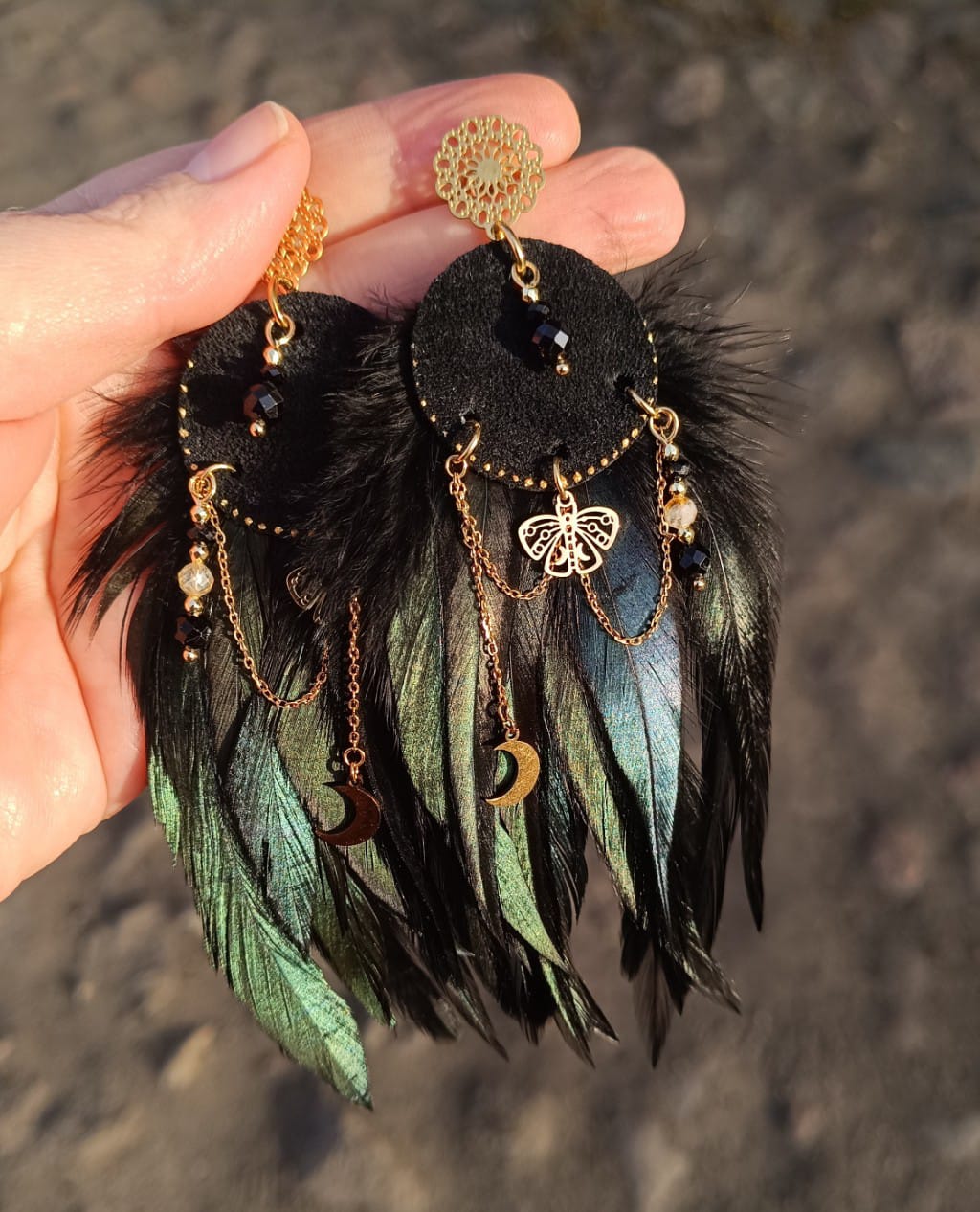 Rajskie Ptaki w czerni. Czarna zamszowa skóra, czarne turmaliny. Lekki przebłysk cytrynów. I do tego przepiękne kogucie pióra, które obłędnie opalizują w świetle. Symbole ćmy dodają tajemniczości. elementy metalowe – stal chirurgiczna. Długość: 13 cm. Kolczyki są bardzo lekkie.